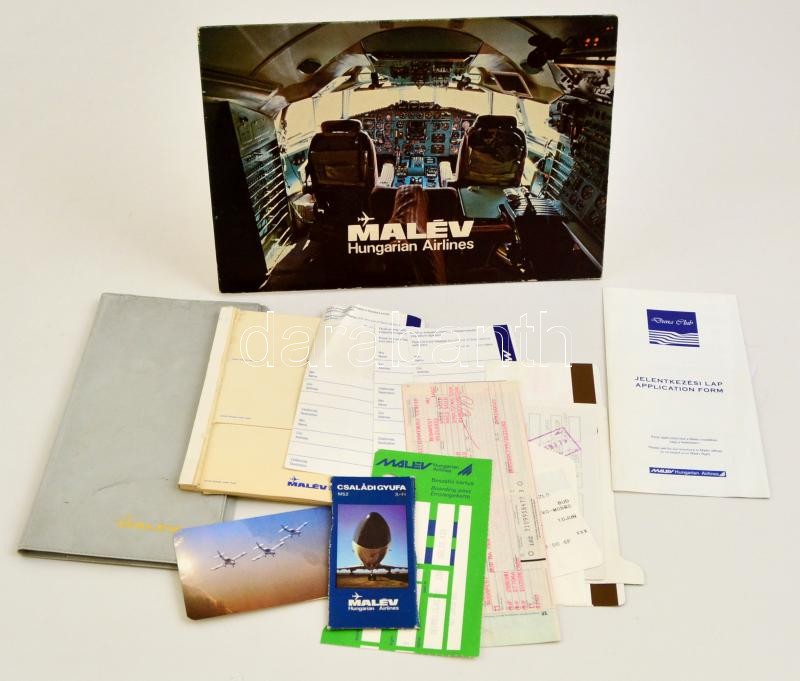 Leírás: MALÉV reklámnyomtatványok, matricák, beszállókártyák, stb.