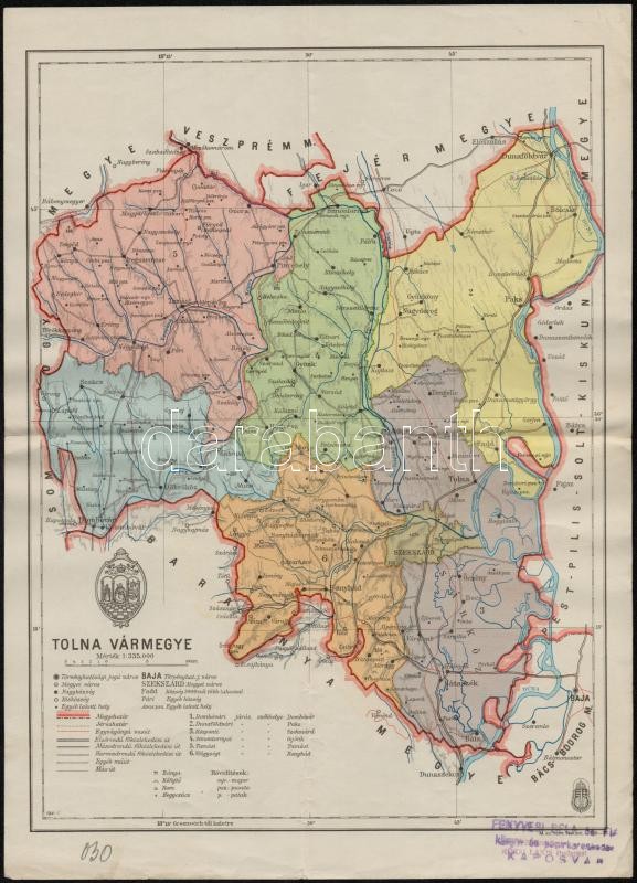 1941 Tolna vármegye térképe, M. kir. honv. térk. intézet, 34×25 cm https://www.darabanth.com/hu/324-Gyorsarveres/324.0/Festmeny-mutargy-papirregiseg-egyeb/Terkepek~29/1941-Tolna-varmegye-terkepe-M-kir-honv-terk-intezet-34C39725-cm~II1768660
