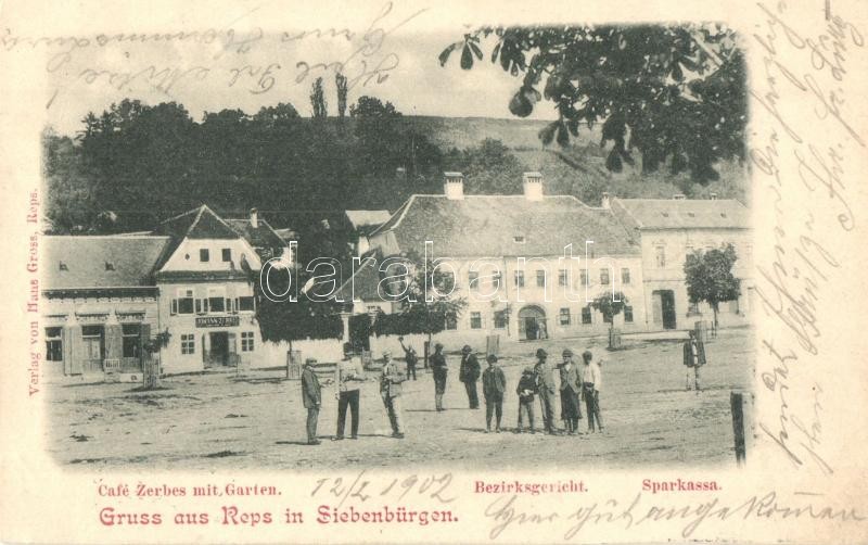 1902 Kőhalom, Reps, Rupea; Café Zerbes mit Garten, Bezirksgericht, Sparkassa. Verlag v. Hans Gross / Johann Zerbes kávéháza, Járásbíróság, Takarékpénztár / café, county court, savings bank (r)