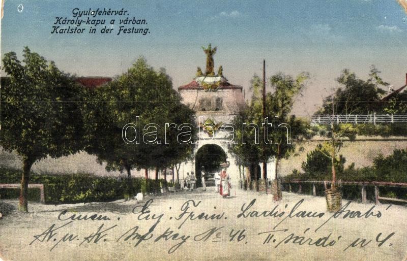 1918 Gyulafehérvár, Karlsburg, Alba Iulia; Károly kapu a várban / cast... https://www.darabanth.com/hu/324-Gyorsarveres/324.0/Kepeslapok/Erdely~2000007/1918-Gyulafehervar-Karlsburg-Alba-Iulia-Karoly-kapu-a-varban-castle-gate-EM~II1800319