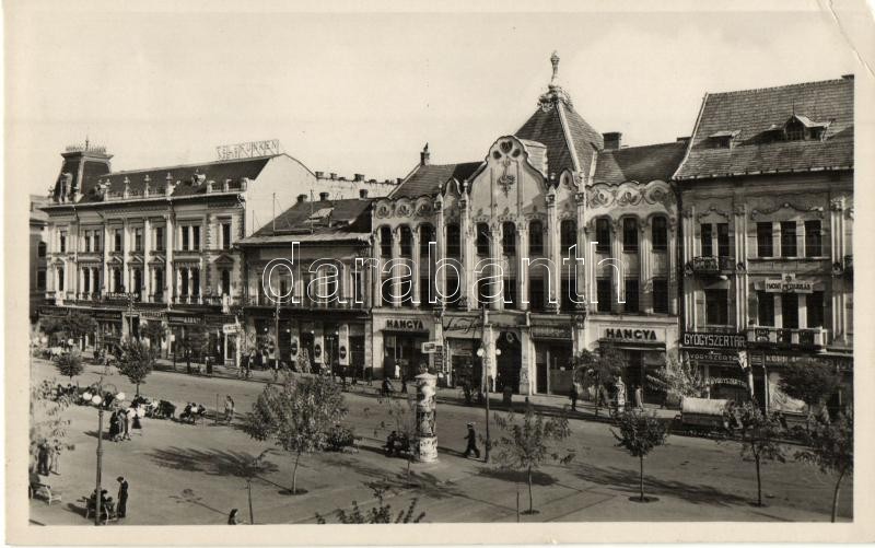 1944 Marosvásárhely, Targu Mures; Széchenyi tér, M. Kir. Államrendőrség palotája, Első Magyar Biztosító, Rosenfeld A. József, Günther Oszkár, Király Cukorka, Gálffy István, Hangya, Szathmáry és Kohn üzlete, gyógyszertár, Magyar Megújulás Pártja / square with shops, pharmacy, insurance company, party's office, police palace (EK)