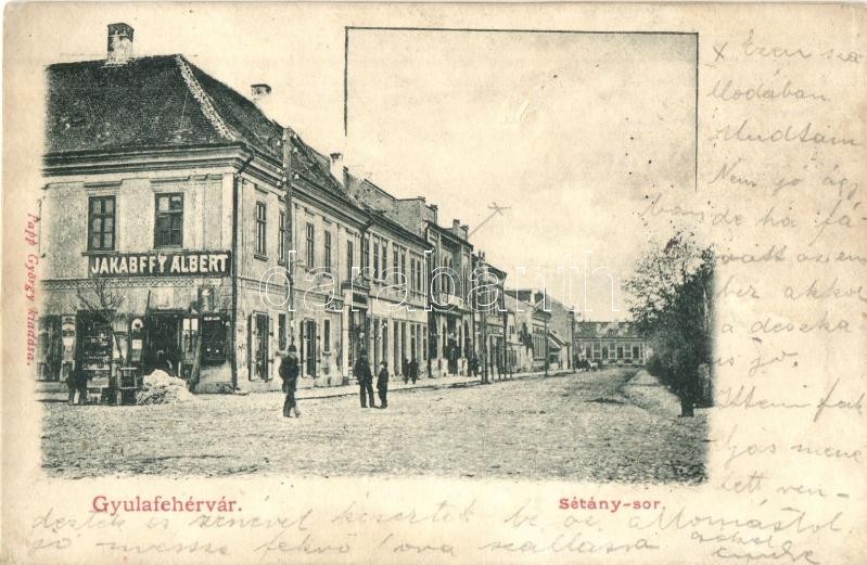 Leírás: Gyulafehérvár, Alba Iulia; Sétány sor, Jakabffy Albert üzlete. Papp György kiadása / promenade street, shops (r)