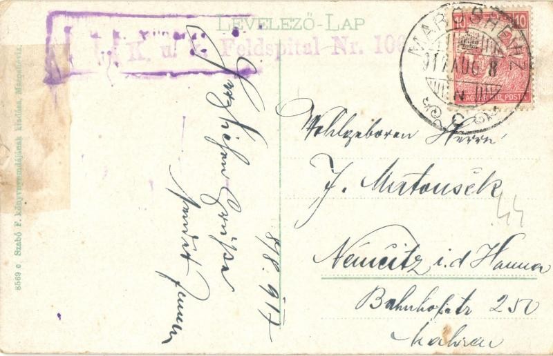 Leírás: Maroshévíz, Toplita; Vasútállomás, pályaudvar, vagonok. Szabó F. kiadása / railway station, wagons + K.u.K. Feldspital Nr. 106. (r)