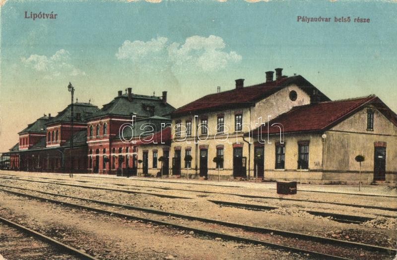 Leírás: Lipótvár, Újvároska, Leopoldov; Vasútállomás, pályaudvar belső része / railway station (EK)