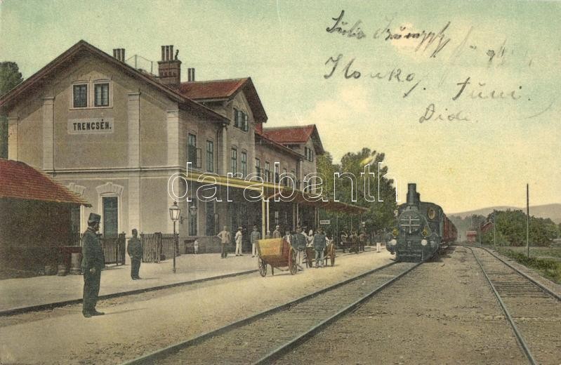 Leírás: Trencsén, Trencín; Vasútállomás, vasutasok, gőzmozdony. Gansel Lipót kiadása / railway station, railwaymen, locomotive (fa)