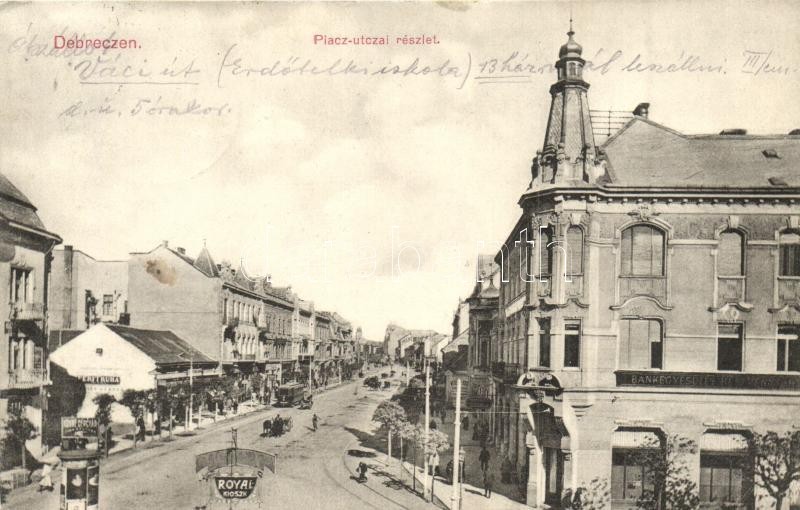 Leírás: Debrecen, Piac utca, villamos, Royal kioszk, üzletek, bank. Ifj. Gyürky Sándor kiadása (EK)