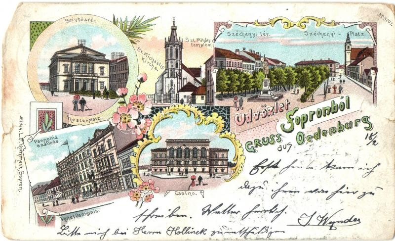 Sopron, Színház tér, Szent Mihály templom, Széchenyi tér, Casino (Kaszinó), Hotel Pannonia szálloda. L. F. Kummert No. 44. Art Nouveau, floral, litho (b)