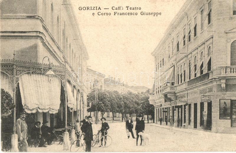 Gorizia, Görz, Gorica; Caffé Teatro e Corso Francesco Giuseppe / Café,... https://www.darabanth.com/hu/324-Gyorsarveres/324.0/Kepeslapok/Olaszorszag~2000028/Gorizia-Gorz-Gorica-Caffe-Teatro-e-Corso-Francesco-Giuseppe-Cafe-street-view-man-with-bicy~II1801581
