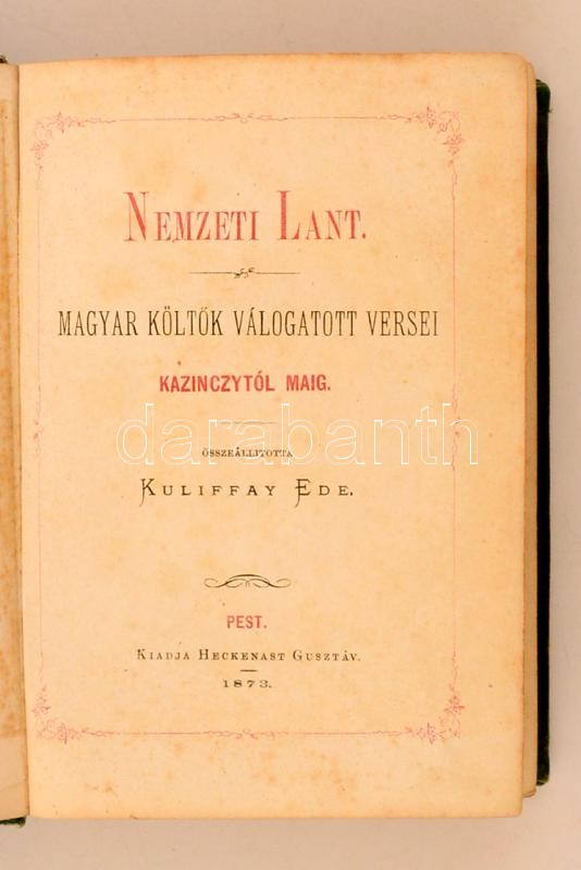 Leírás: Kuliffay Ede(összeáll.): Nemzeti lant. Magyar költők válogatott versei Kazinczytól máig. Pest, 1873, Heckenast Gusztáv. Kiadói aranyozott egészvászon kötés, kopottas állapotban.