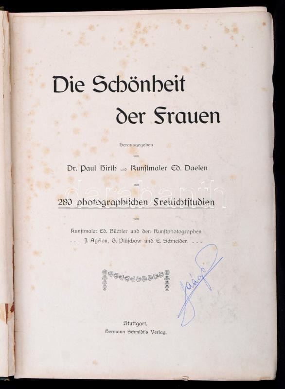 Die Schönheit der Frauen. Szerk.: Dr. Paul Hirth, Eduard Daelen. Stuttgart, [1890], Hermann Schmidt's Verlag, 4. sztl. lev+ 311+1 p. Számos egészoldalas és szövegközti erotikus képekkel illusztrált. Kiadói egészvászon kötésben, kopott borítóval, 4 kijáró lappal (címlap, tartalomjegyzék, 307/308. ), foltos lapokkal.
