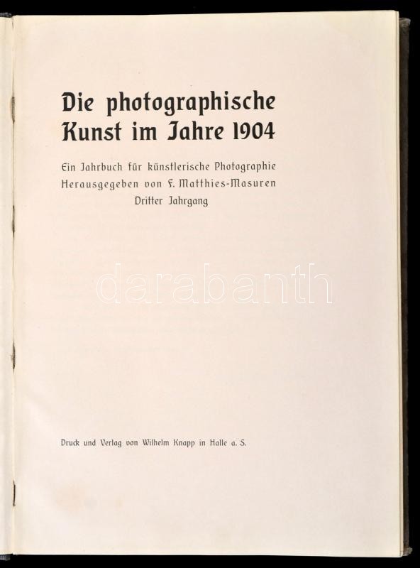 Die photographische Kunst im Jahre 1904. Ein Jahrbuch für künstlerische Photographie Herausgegeben von f. Matthies-Masuren. Dritter Jahrgang. Halle, 1904, Wilhelm Knapp. Kiadói félvázon kötés, kopottas állapotban / half linen binding, little damagaed condition