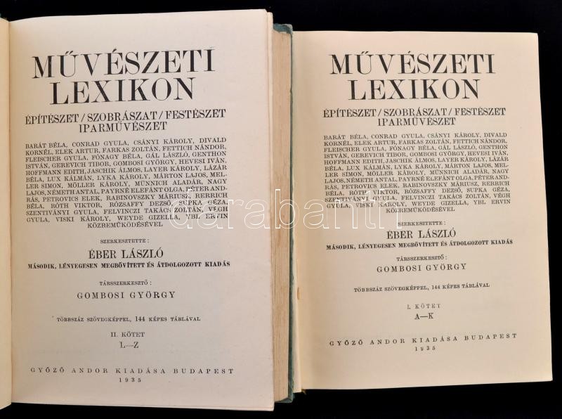 Leírás: Művészeti lexikon. Szerk.: Éber László, Gombosi György. 1-2. köt. Bp., 1935, Győző Andor. Kiadói aranyozott egészvászon-kötés, kopottas borítóval, a II. kötetben laza fűzéssel, két kijáró illusztrációval.