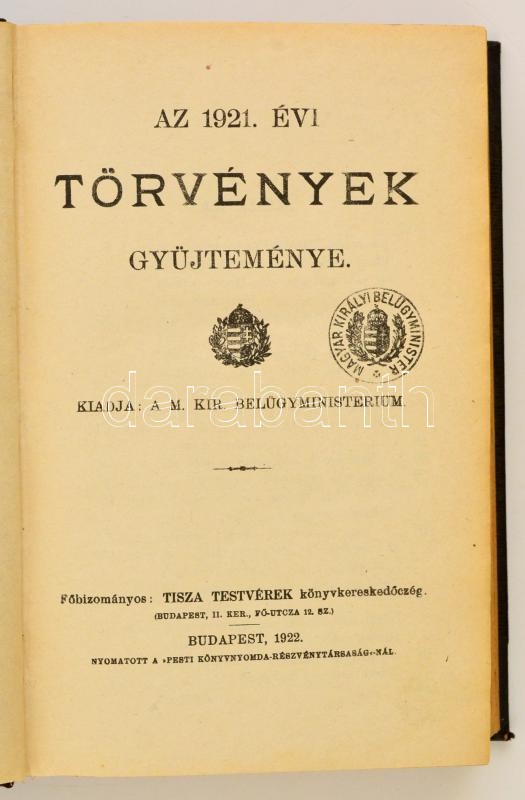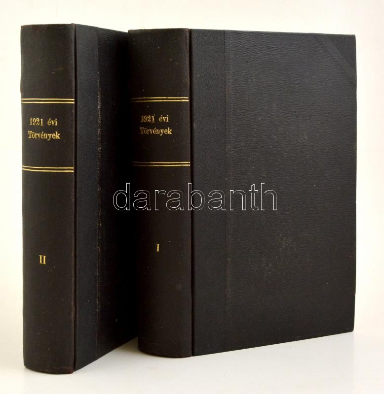 1921 évi törvények gyűjteménye I.-II. Bp., 1922. M. kir. Belügyminisztérium. Magyar és francia nyelven a trianon utáni törvények. Korabeli egészvászon kötésben, egy lap kijár,