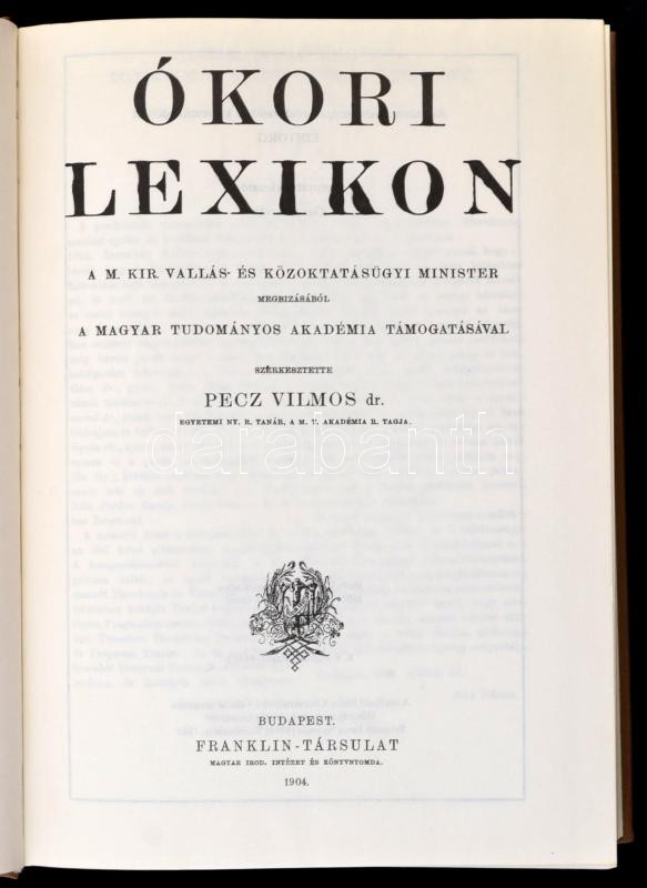 Ókori Lexikon I-IV. Szerk.: Dr. Pecz Vilmos. Tudománytár. Bp., 1984, Könyvértékesítő Vállalat. Kiadói egészvászon kötés, szövegközti és egészoldalas illusztrációkkal. 1902 és 1904. évi kiadás hasonmás kiadása.