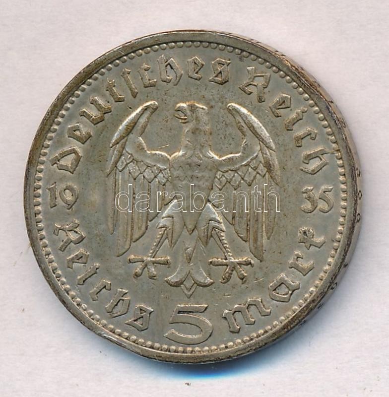 G... https://www.darabanth.com/hu/324-Gyorsarveres/324.0/Numizmatika/Kulfoldi-fem-es-ezustpenzek~2500013/Nemet-Harmadik-Birodalom-1935A-5M-Ag-Hindenburg-T2-ph-German-Third-Reich-1935A-5-Mark-Ag-Hind~II1784437