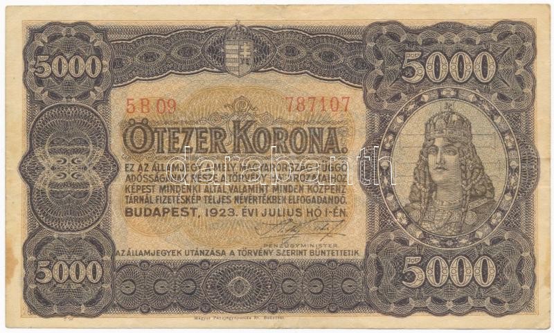 Leírás: 1923. 5000K "Magyar Pénzjegynyomda Rt. Budapest" T:III kis fo.