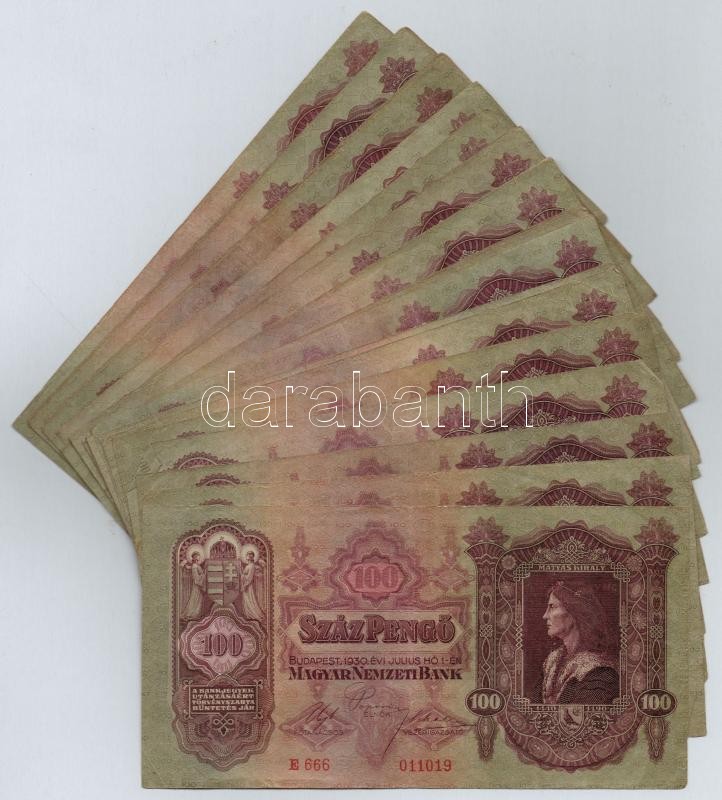 1930. 100P (30x) T:II-,III https://www.darabanth.com/hu/324-Gyorsarveres/324.0/Numizmatika/Magyar-bankjegyek~2500007/1930-100P-30x-TII-III~II1800898