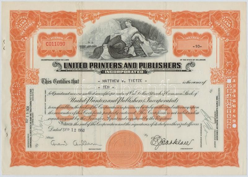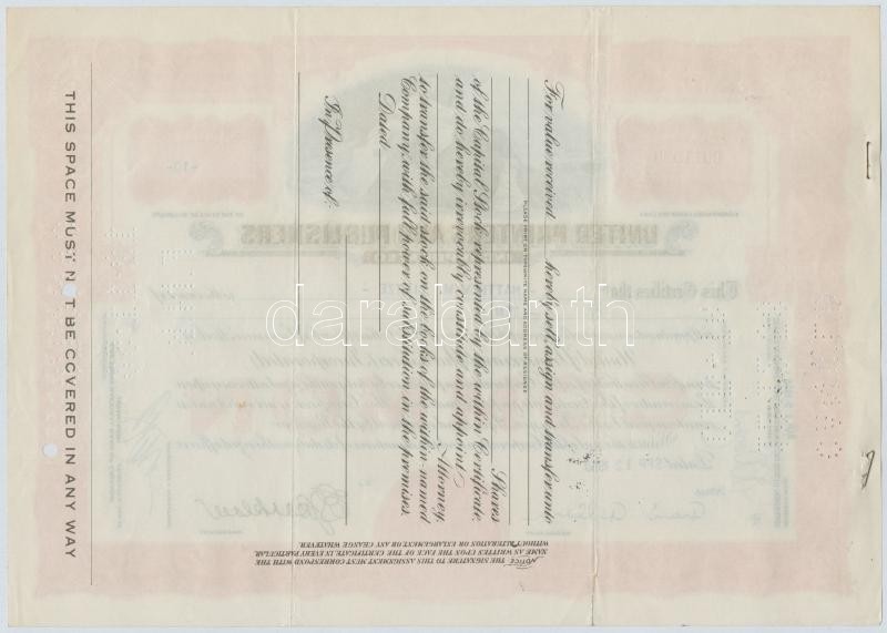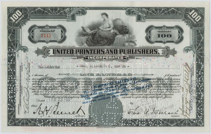Amerikai Egyesült Államok 1937. "United Printers and Publishers Incorporated" névre szóló, 100db részvénye felülbélyegzéssel + 1950. "United Printers and Publishers Incorporated" névre szóló, 10db részvénye. Mindkettő perforációval érvénytelenítve T:III
