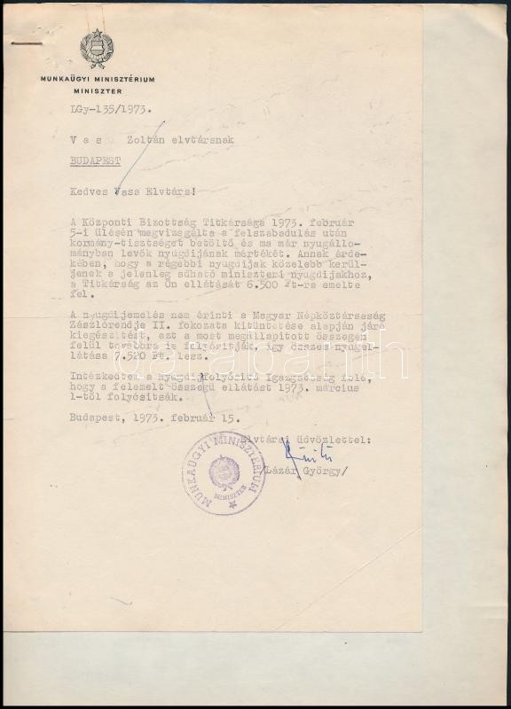 Leírás: 1973 Lázár György későbbi miniszterelnök saját kézzel aláírt levele Vas Zoltán (1903-1983) író, 56-os államminiszter részére Vas nyugdíjának ügyében
