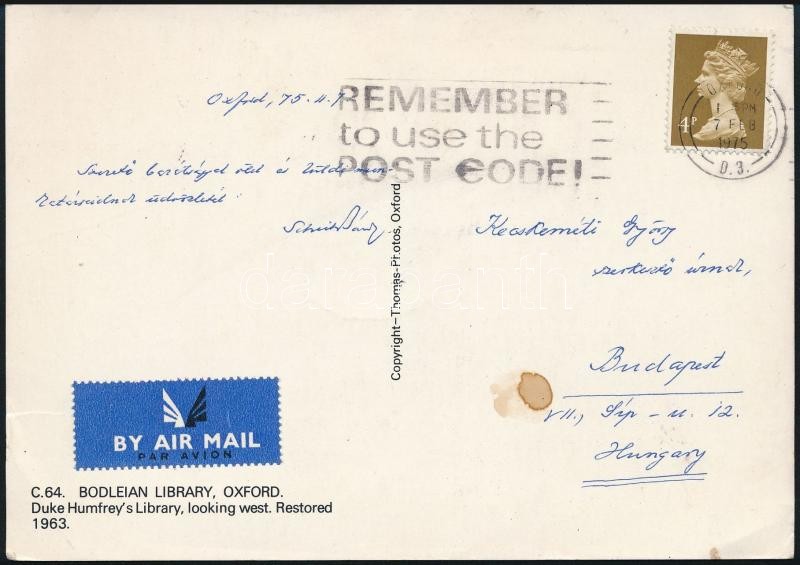 Leírás: 1975 Scheiber Sándor hebraista, nyelvész üdvözlő sorai és aláírása Oxfordból küldött levelezőlapon
