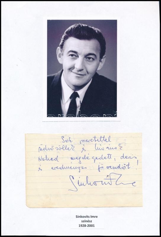 Leírás: Sinkovits Imre (1928-2001) színész aláírása papírlapon, fényképpel