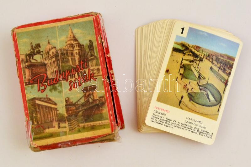Budapesti séták, játékkártya pakli, viseltes dobozban https://www.darabanth.com/hu/325-Gyorsarveres/325.0/Festmeny-mutargy-papirregiseg-egyeb/Bolhapiac~12/Budapesti-setak-jatekkartya-pakli-viseltes-dobozban~II1808232