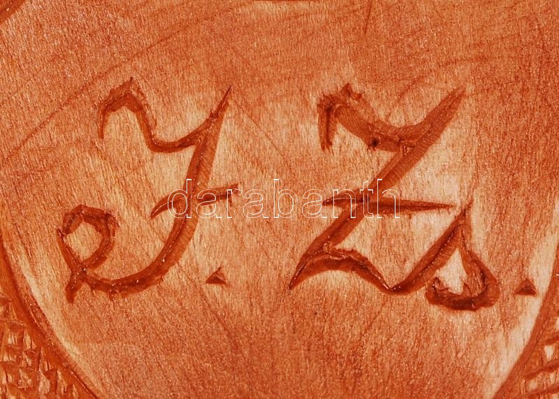 Leírás: Jankovics Zsolt (1960-): Trófea alátét, faragott hárs fa, pácolt, jelzett, 24×23 cm