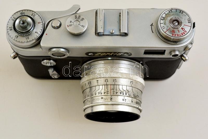 1964 Zorkij-6 távmérÅ‘s fényképezÅ‘gép, Jupiter 8 f/2 50mm objektÃvvel, Excelsior 3 fénymérÅ‘vel, eredeti bÅ‘r tokjában, eredeti dobozában, orosz nyelvű leÃrással, Fortepan filmmel, működÅ‘képes, szép állapotban / Vintage Russian rangefinder camera, with light meter, original case and box, in working, nice condition