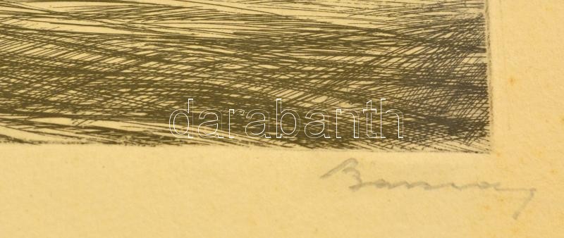Leírás: Barcsay Jenő (1900-1988): Alföldi táj, rézkarc, papír, jelzett, üvegezett fa keretben, 15×22 cm