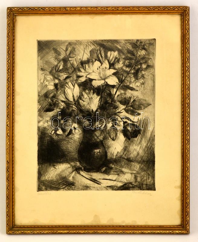 Leírás: Bordás Ferenc (1911-1982): Csendélet, rézkarc, papír, jelzett, üvegezett fa keretben, 39×30 cm
