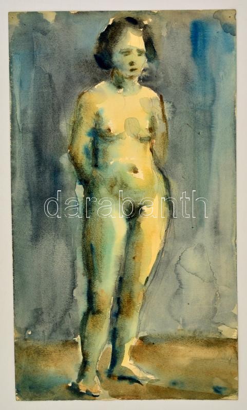 Jelzés nélkül: Álló női akt. Akvarell, papír, 43×25 cm https://www.darabanth.com/hu/325-Gyorsarveres/325.0/Festmeny-mutargy-papirregiseg-egyeb/Festmenyek-es-grafikak~32/Jelzes-nelkul-Allo-noi-akt-Akvarell-papir-43C39725-cm~II1786771