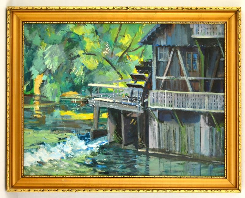 Jelzés nélkül: Vízimalom. Olaj, vászon, keretben, 60×80 cm https://www.darabanth.com/hu/325-Gyorsarveres/325.0/Festmeny-mutargy-papirregiseg-egyeb/Festmenyek-es-grafikak~32/Jelzes-nelkul-Vizimalom-Olaj-vaszon-keretben-60C39780-cm~II1786376