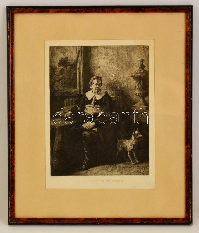 Leírás: Leon jelzéssel: La lecture interrompue, rézkarc, papír, paszpartuban, üvegezett fa keretben, 31×23 cm