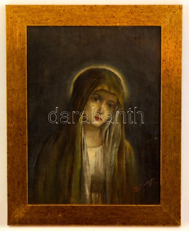 Leírás: Olvashatatlan jelzéssel: Szűz Mária, olaj, selyem, üvegezett fa keretben, 38×28 cm