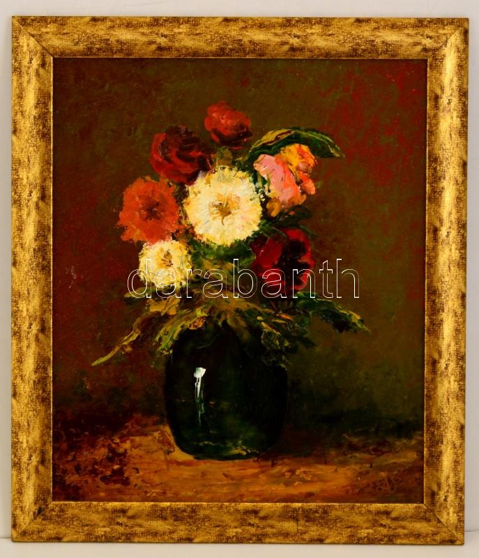 Leírás: Olvashatatlan jelzéssel: Virág csendélet, olaj, farost, keretben, 43,5×36,5 cm