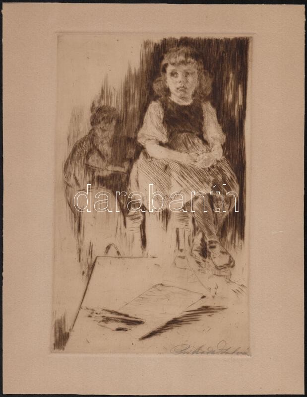 Leírás: Prihoda István (1891-1956): Merengő kislány, rézkarc, papír, jelzett, 29×18 cm