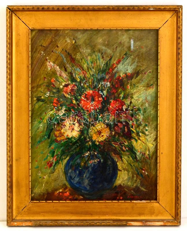 Leírás: Záhonyi jelzéssel: Virágcsendélet. Olaj, farost, üvegezett keretben, 44×34 cm
