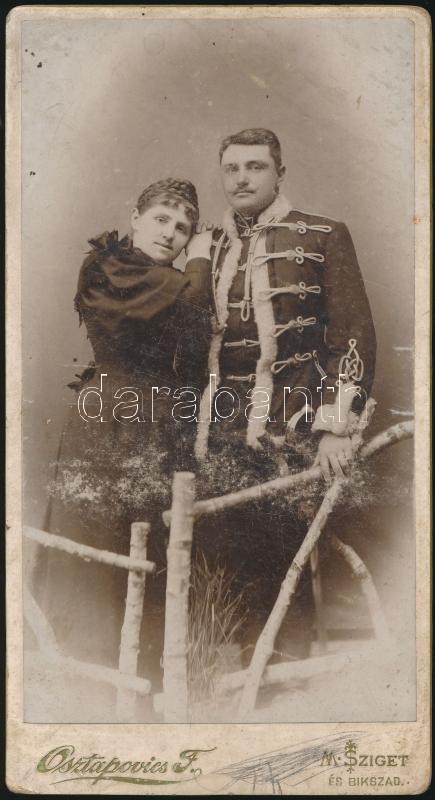 Leírás: cca 1900 Azonosítatlan férfi és felesége díszmagyarban, keményhátú fotó ifj. Osztapovics Ferenc műterméből (Máramarossziget/Bikszád), 20,5×11 cm
