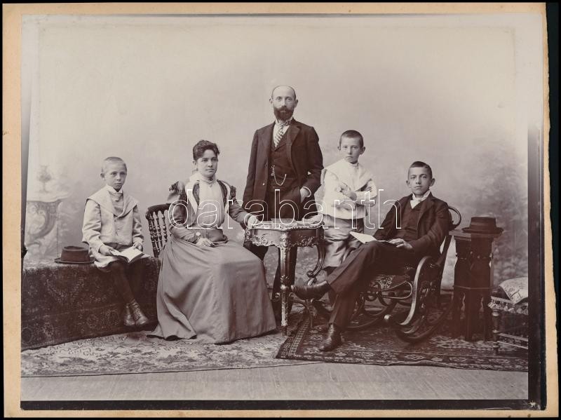 Leírás: cca 1900 Polgárcsaládportéja, fotó Székely Aladár műterméből, kartonon, a hátoldalán pecséttel jelzett, körbevágott kartonnal, 20x27 cm.