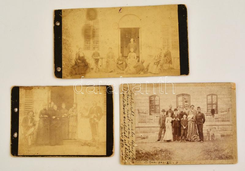 cca 1900 Vegyes fotó tétel, 3 db keményhátú fotó, rajta csoportképekkel, kettő feliratozva, kartonok kopottak, 2 db sérült, 11x21 cm és 11x16 cm közötti méretben