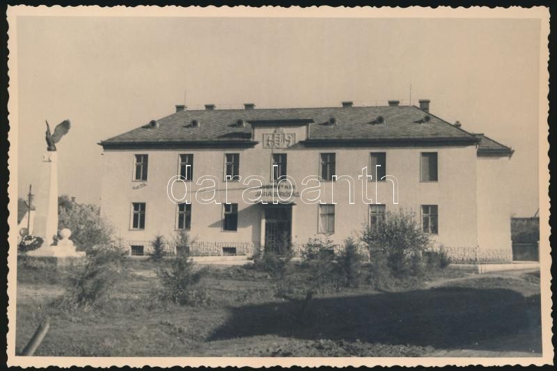 Leírás: cca 1930 A tiszafüredi járásbíróság épülete elkészülte után, homlokzatán angyalos címerrel, előtte a hősi emlékművel, fotó, 11,5×17,5 cm