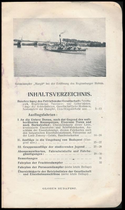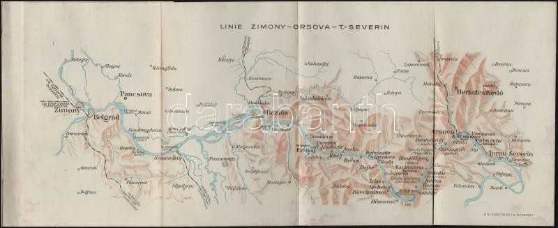 Leírás: cca 1900 Magyar Királyi Folyam és Tengerhajózási Rt. ismertető füzet 32p. + 2 kihajtható térkép. kissé piszkos papírkötésben.