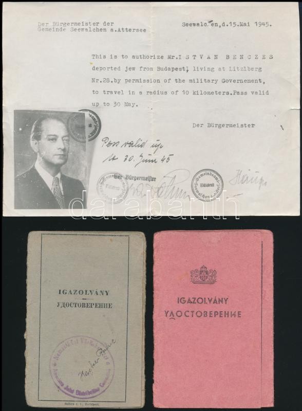 Leírás: 1917-1945 Zsidó személy iratai: születési anyakönyvi kivonat, leszármazási tábla, igazolványok, stb., összesen 5 db