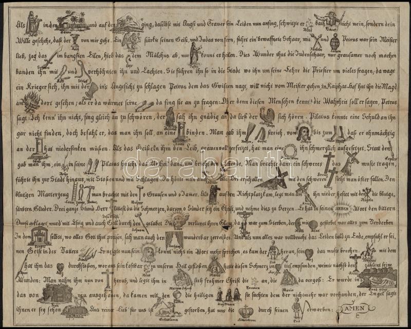 Leírás: XVIII. sz. Ima szövege, benne középkori figurális ábrázolásokkal. Rézmetszet. Hajtásnyomokkal. / Etched prayer with interesting figures. 37x31 cm