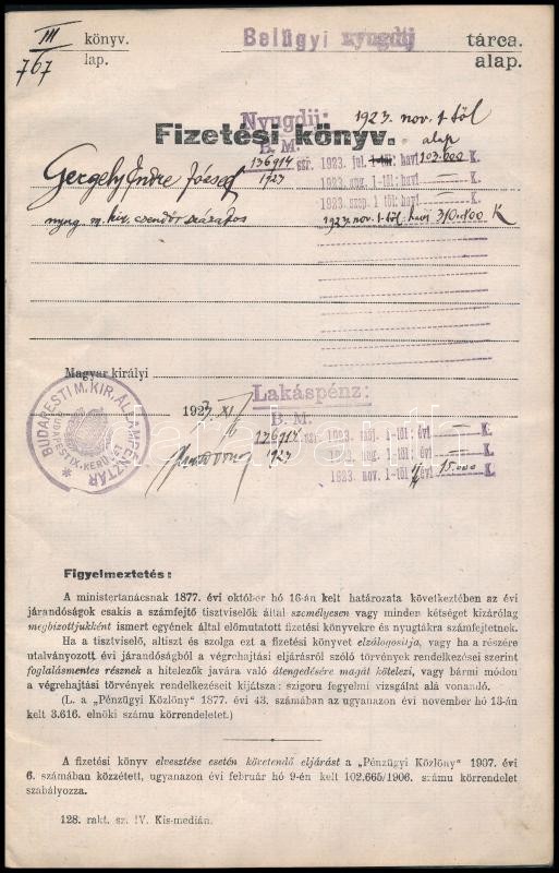 Leírás: 1923-1924 Gergely Endre (1885-1938) térképész, ny. m. kir. csendőr százados fizetési könyve.