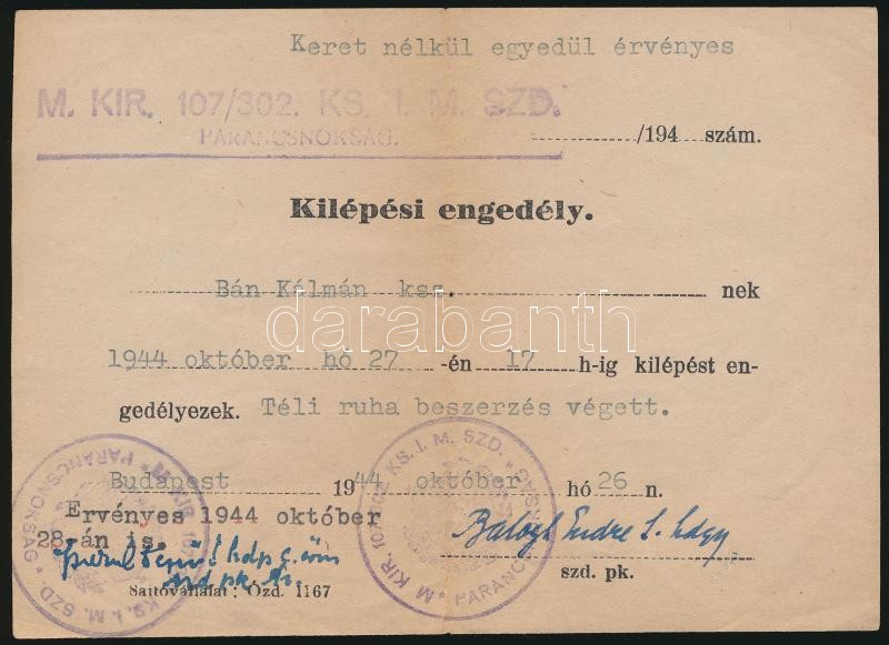 1944 Bp., Kilépési engedély, keret nélkül egyedül érvényes, téli ruha ... https://www.darabanth.com/hu/325-Gyorsarveres/325.0/Festmeny-mutargy-papirregiseg-egyeb/Militaria~27/1944-Bp-Kilepesi-engedely-keret-nelkul-egyedul-ervenyes-teli-ruha-beszerzese-celjabC3~II1807429