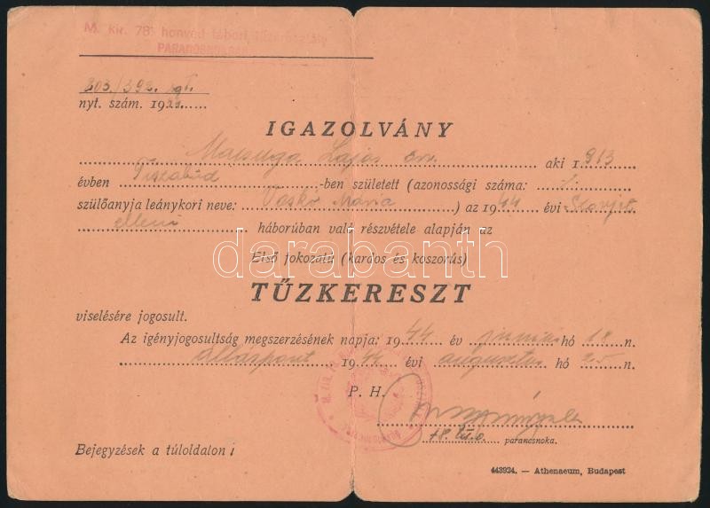 1944 Tűzkereszt viselésére jogosító igazolvány, M. kir. 78. honvéd táb... https://www.darabanth.com/hu/325-Gyorsarveres/325.0/Festmeny-mutargy-papirregiseg-egyeb/Militaria~27/1944-Tuzkereszt-viselesere-jogosito-igazolvany-M-kir-78-honved-tabori-tuzerosztaly-pa~II1808945
