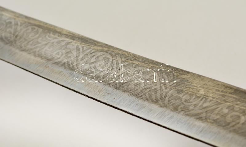 Leírás: Indiai díszkard, maratott pengével, plüss hüvely borítással, réz markolattal, h:86 cm (91 cm)