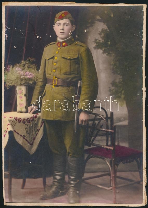 Leírás: cca 1900 Fiatal katona portréja, színezett fotó, kartonra ragasztva, 23×16,5 cm