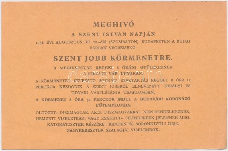 Leírás: 1938 Szent Jobb körmenetre szóló meghívók